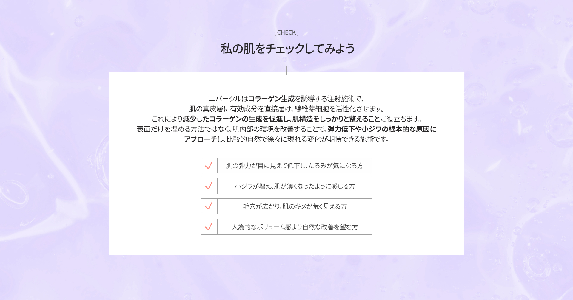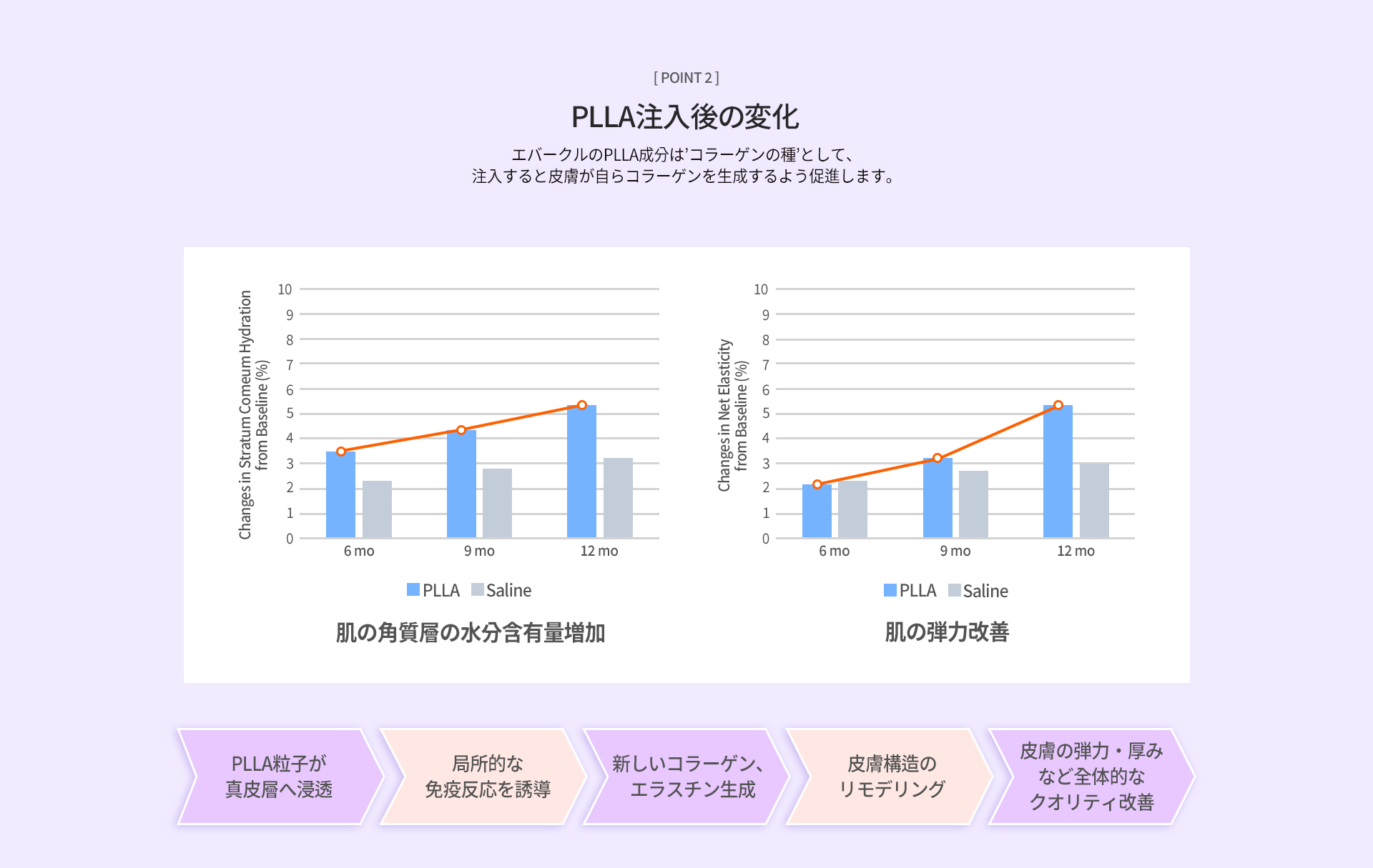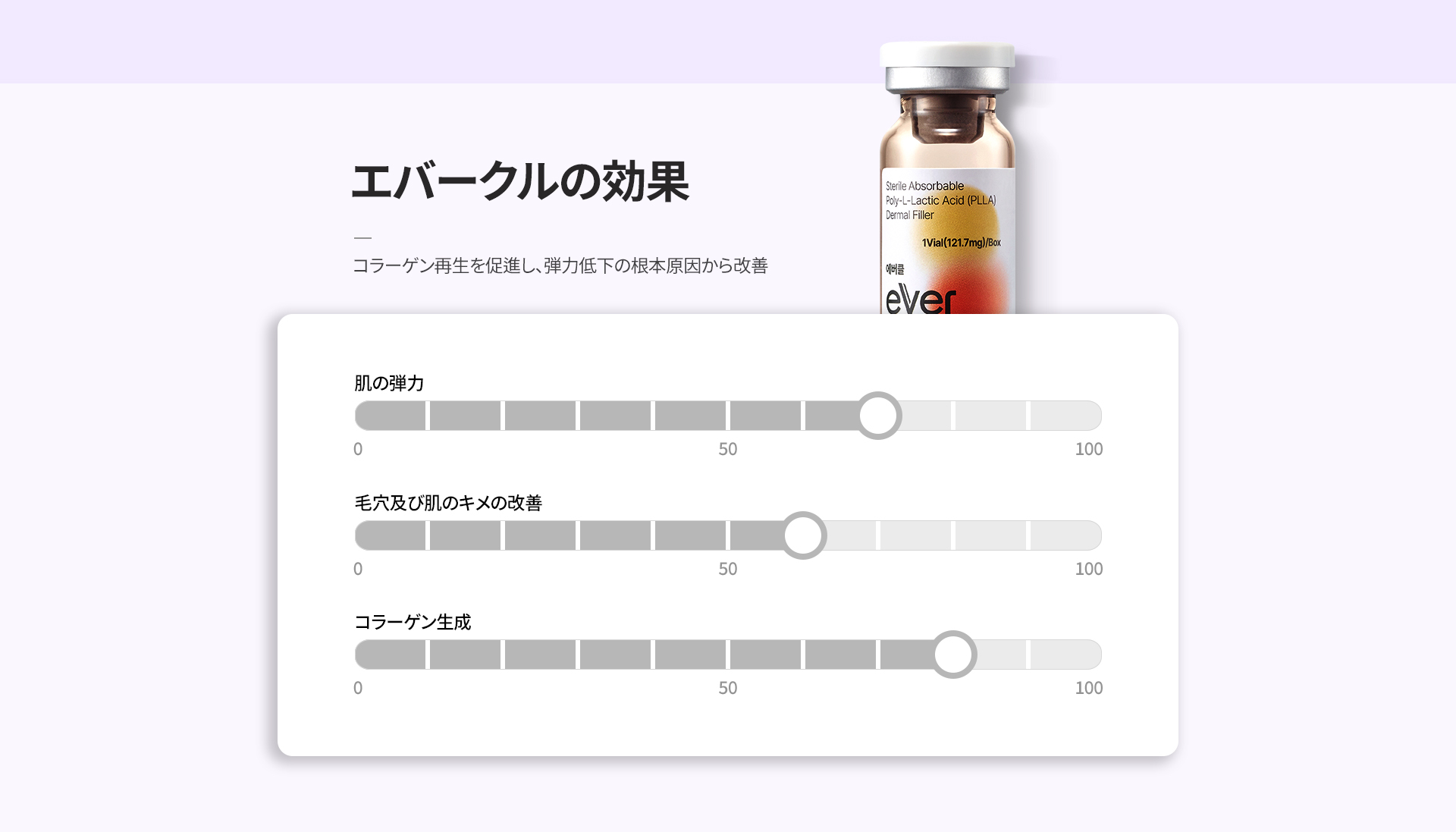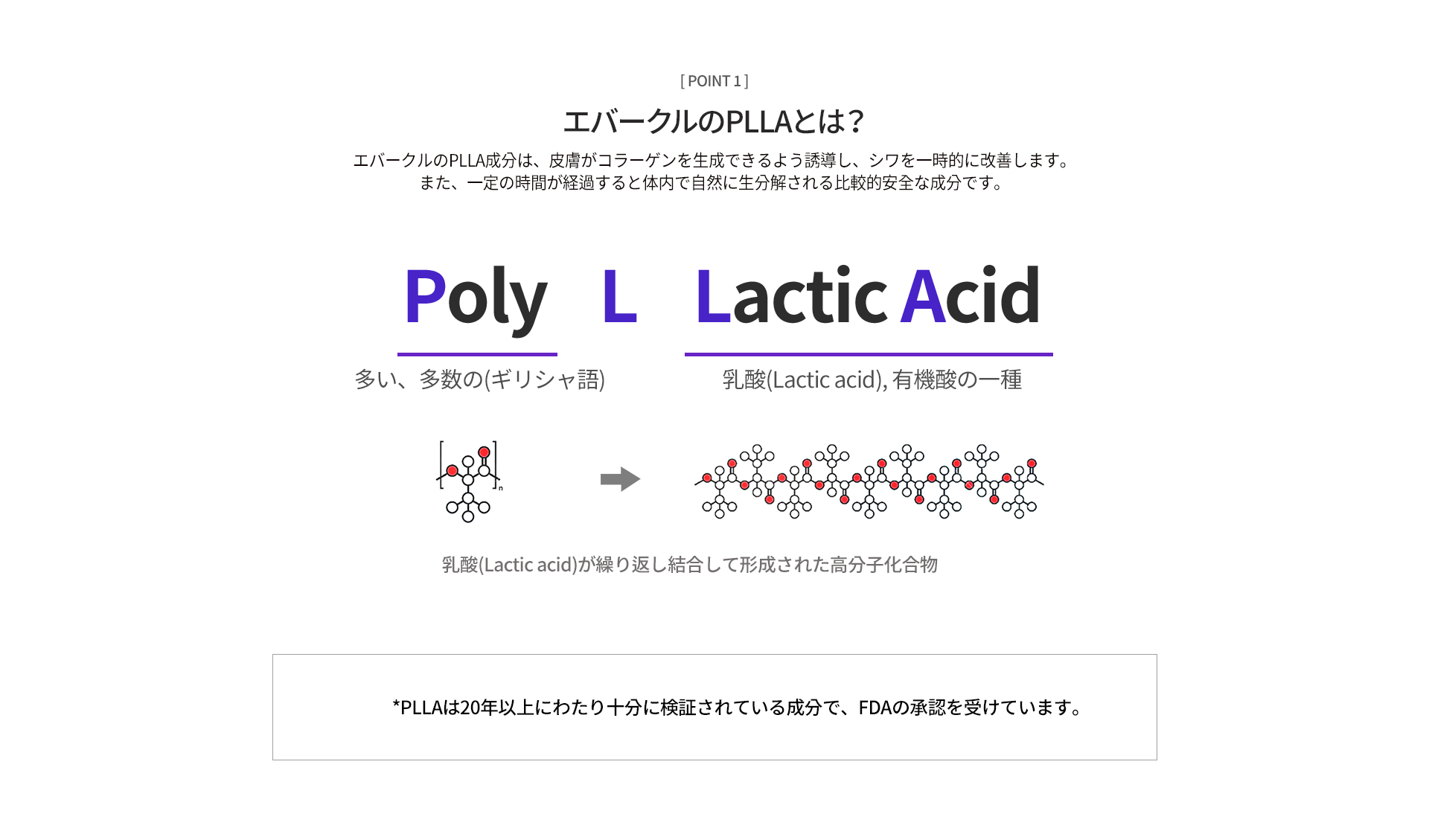 PLLA再生成分が自己コラーゲンの生成を促し、肌が自ら再生する力をサポートします。 弾力の低下や小じわ、肌のキメ改善に効果が期待できる、次世代の肌再生注射です。
