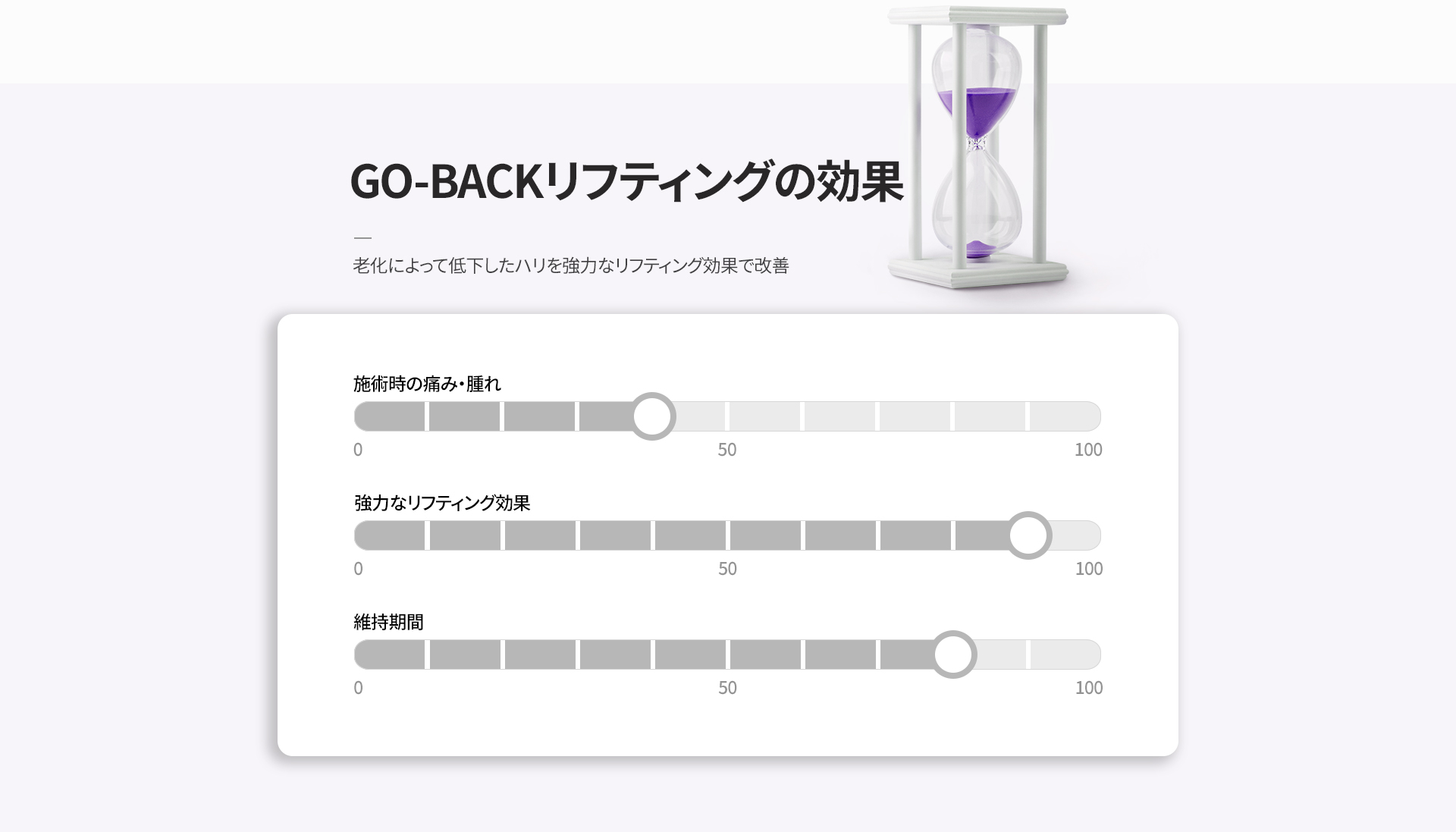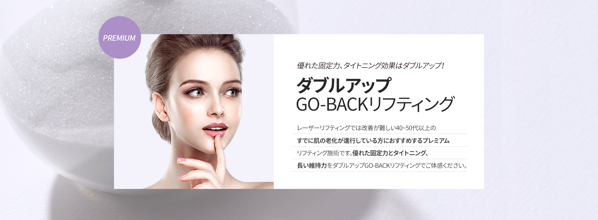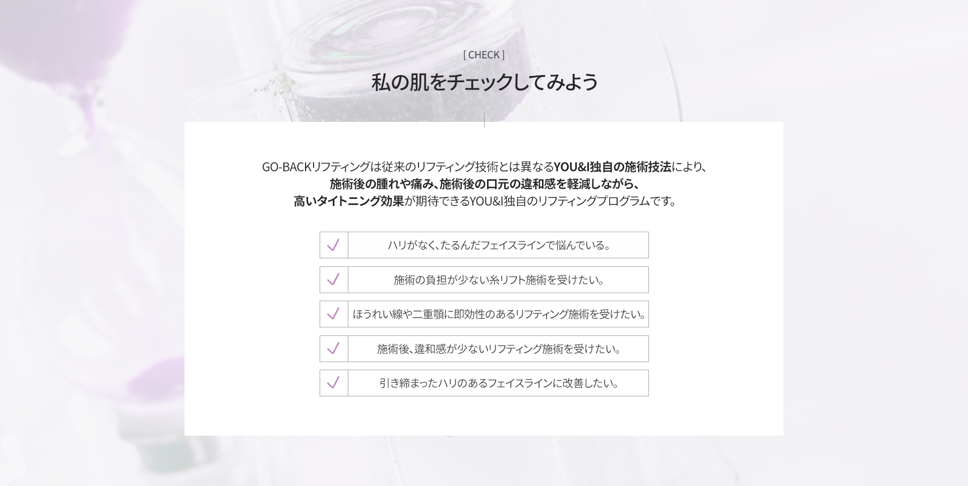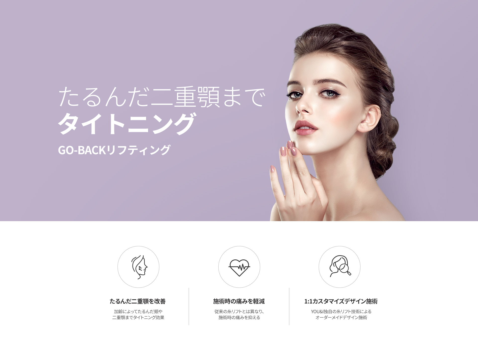 GO-BACKリフティングは、YOU&I独自の施術技法により、施術時の腫れや痛み、施術後の口周りの違和感を軽減しながら、強力なタイトニング効果を実感いただける施術です。