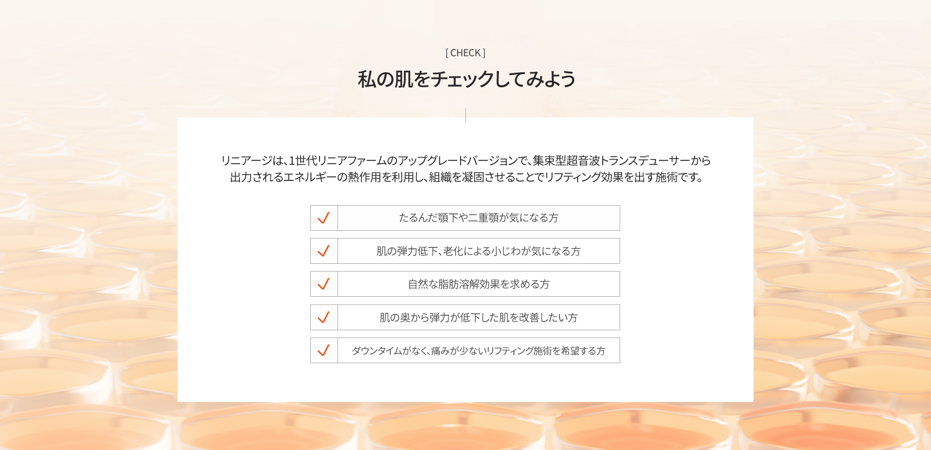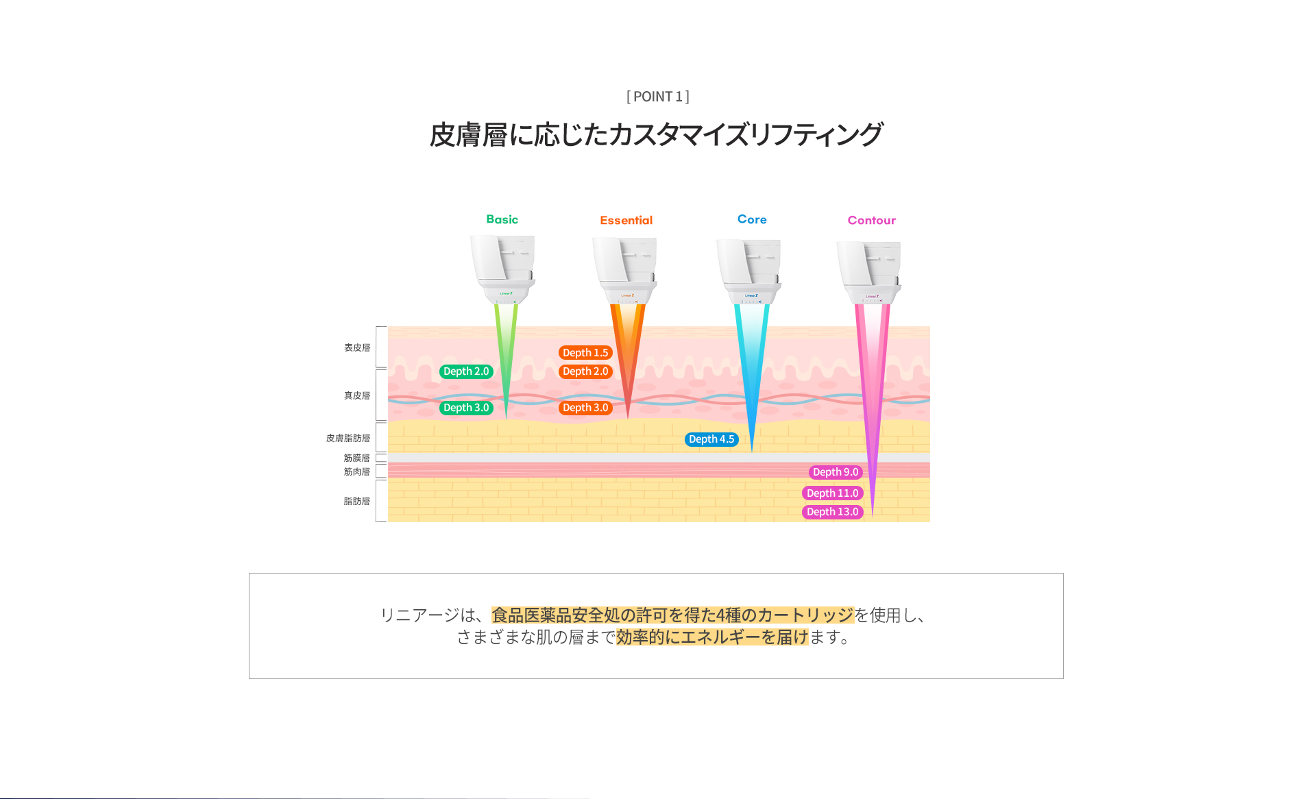 リニアージは、エネルギーの熱作用を利用して組織を凝固させ、リフティング効果をもたらす施術です。
