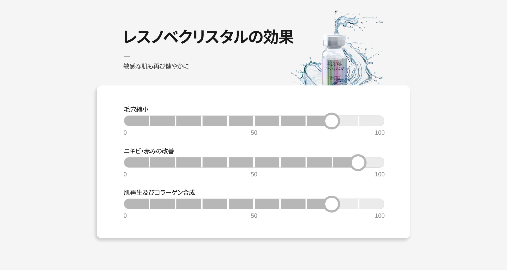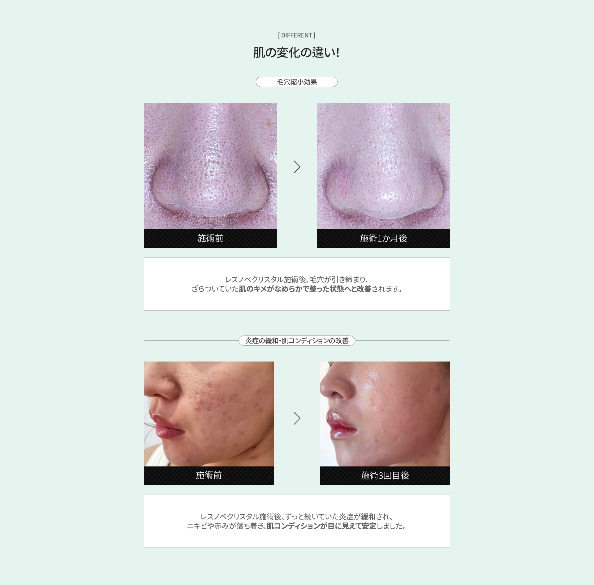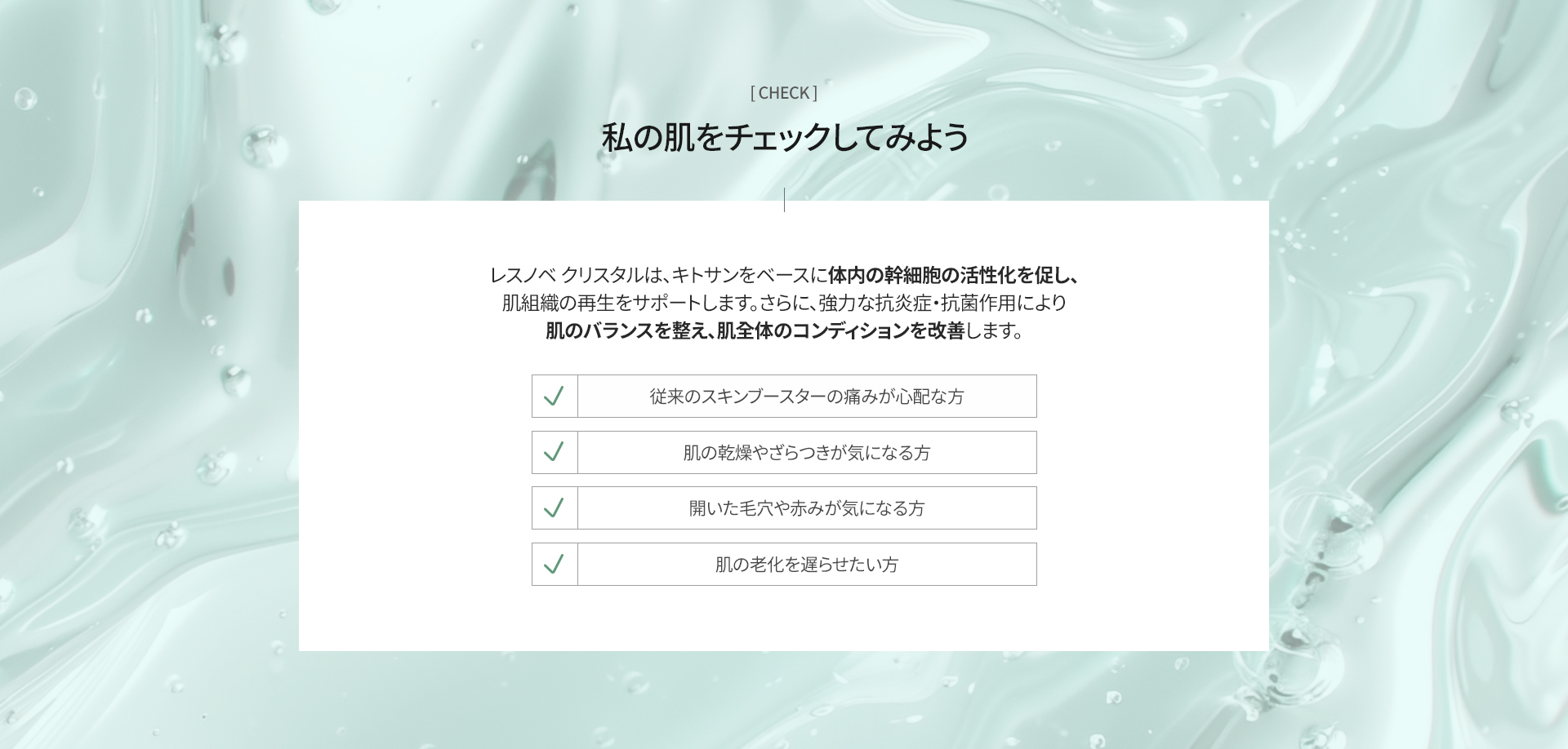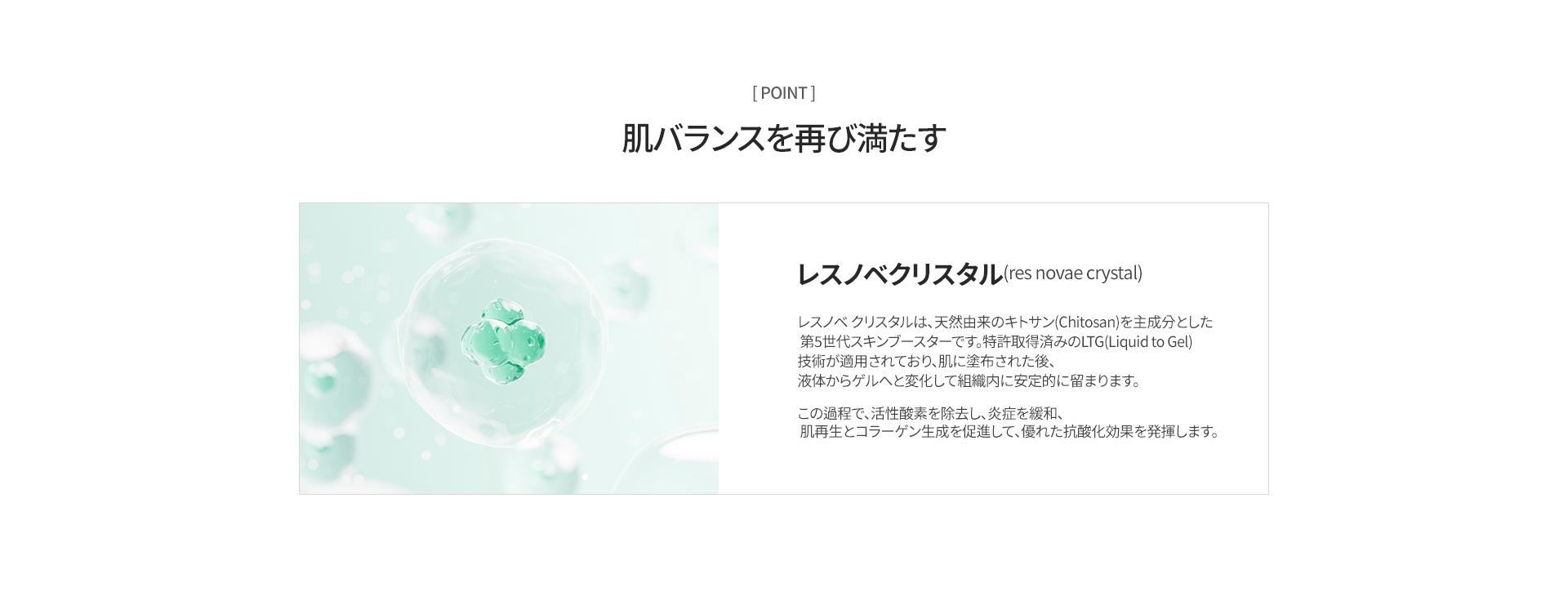 キトサンを基にして体内の幹細胞の活性化を促し、皮膚組織の再生を助けるとともに、強力な抗炎症・抗菌作用で皮膚のバランスを改善し、全体的な肌コンディションを向上させます。