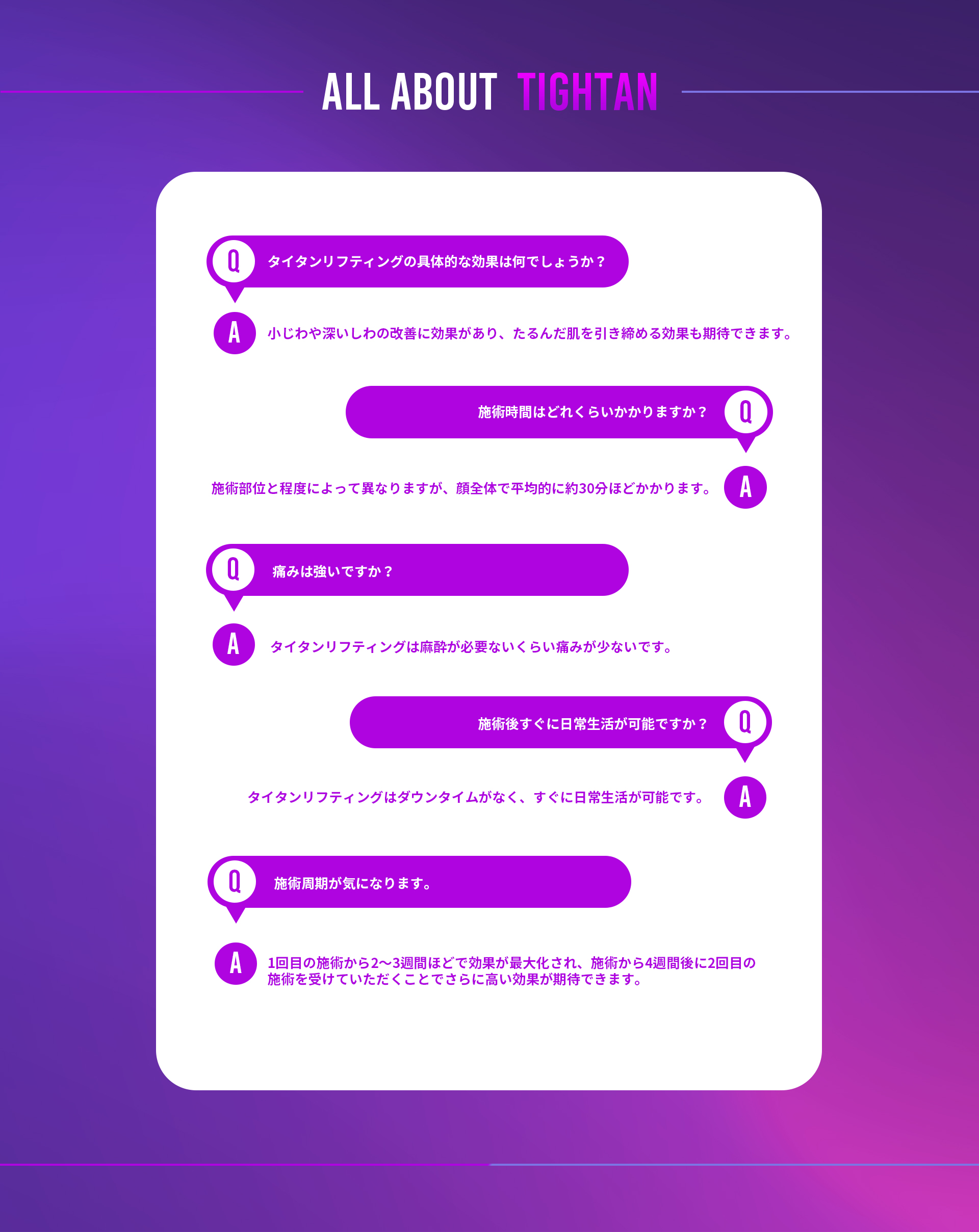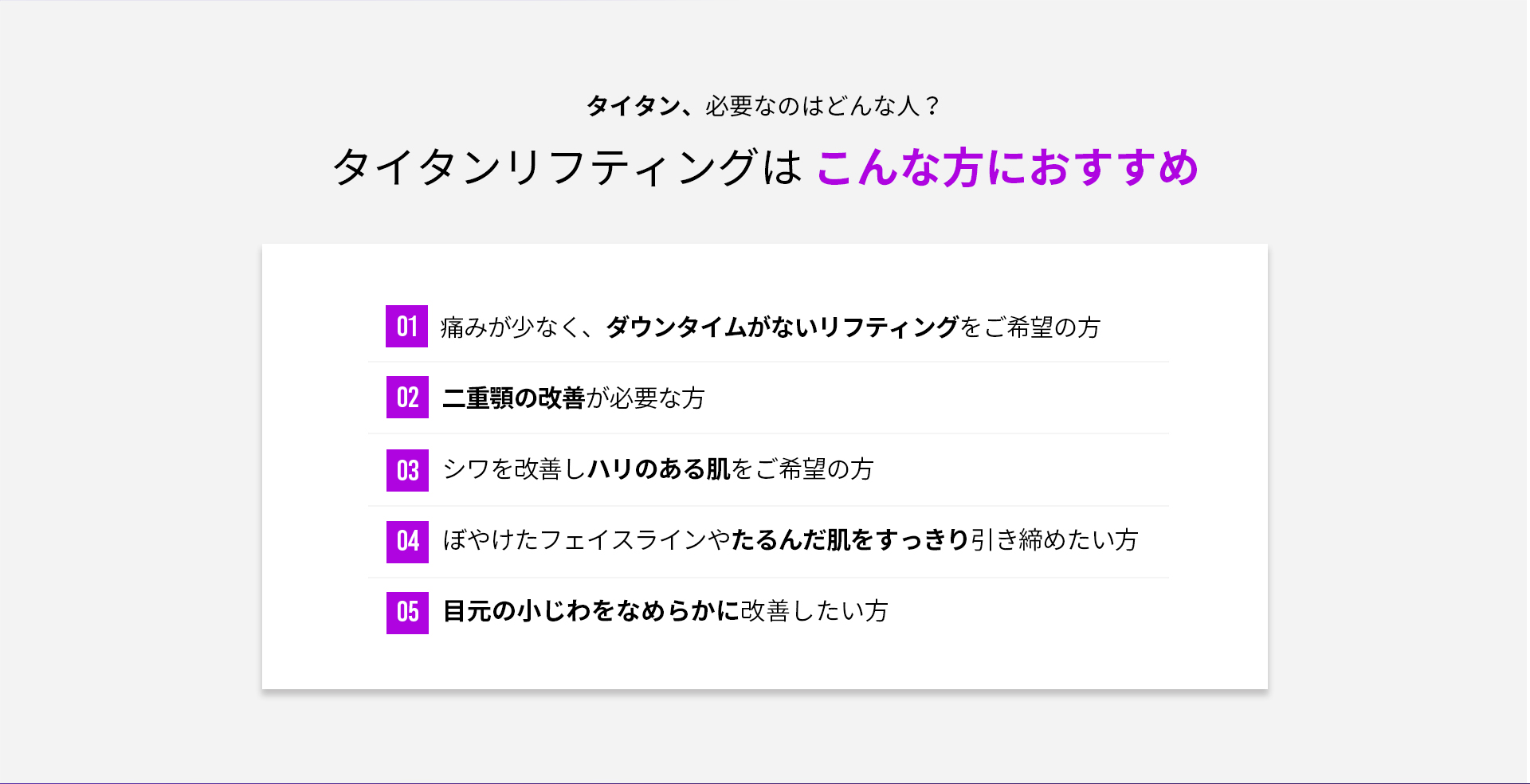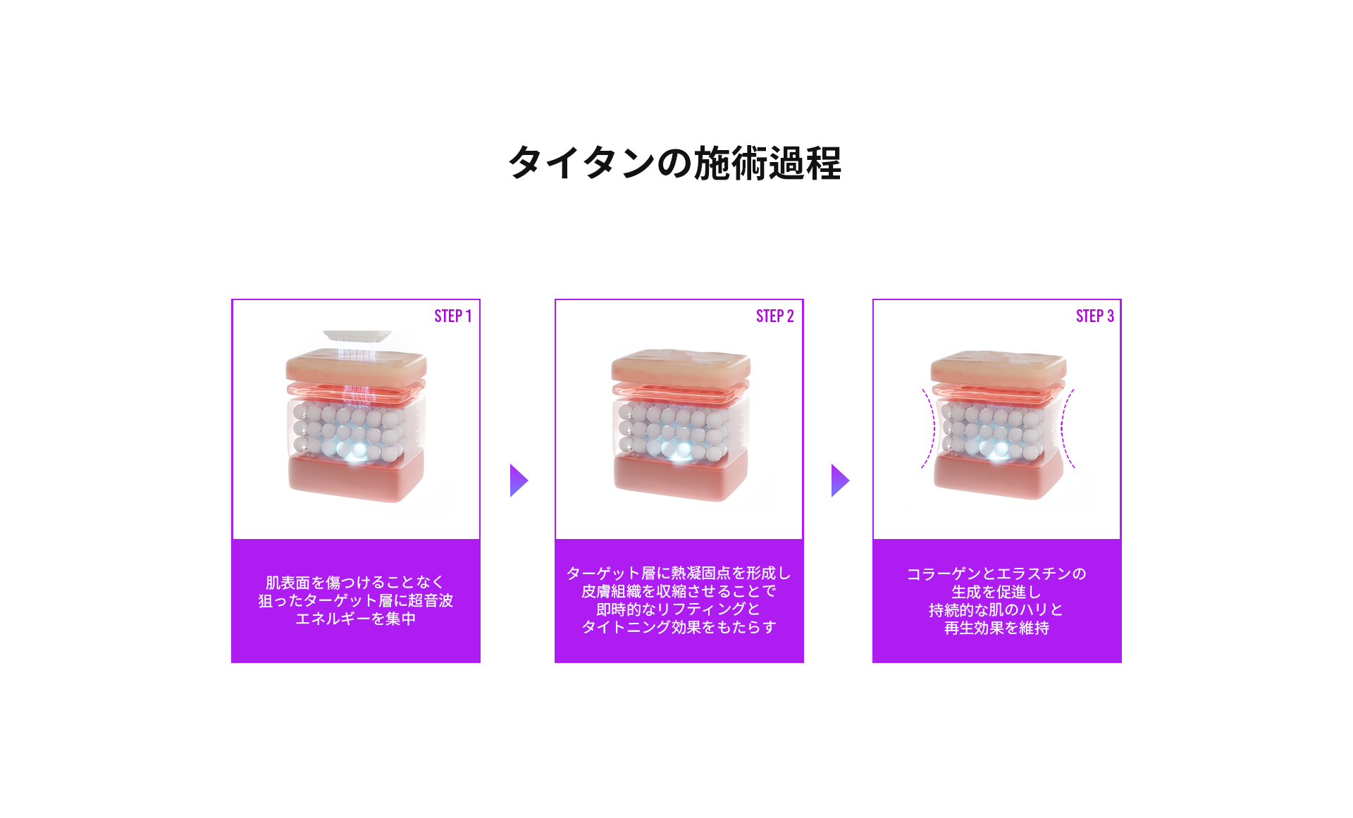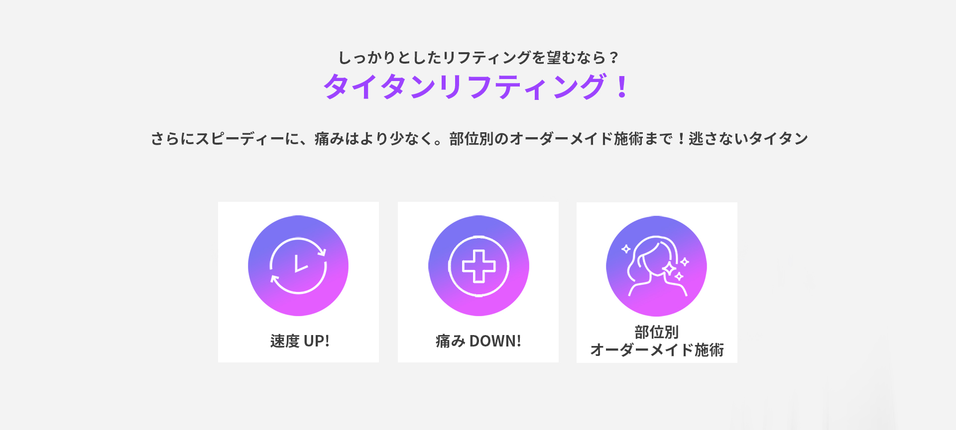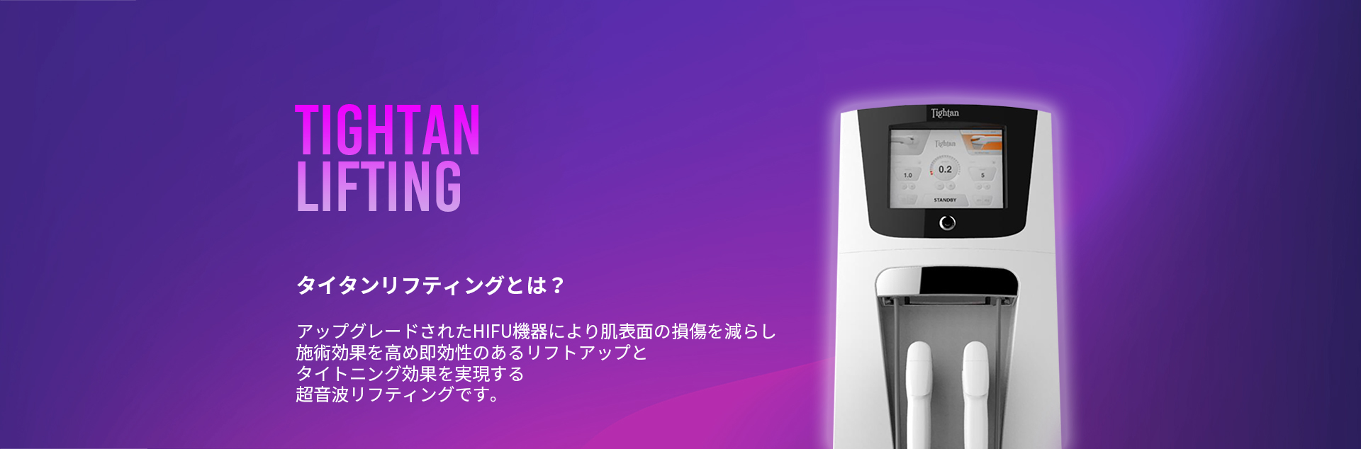 タイタンリフティングは、皮膚表面のダメージを抑えつつ施術効果を高め、即時のリフティングとタイトニング効果をもたらす超音波リフティングです。
